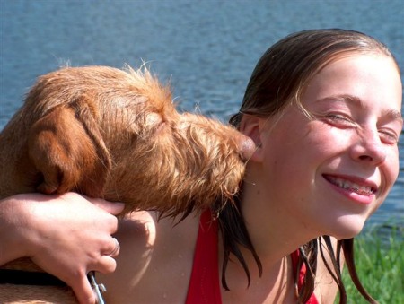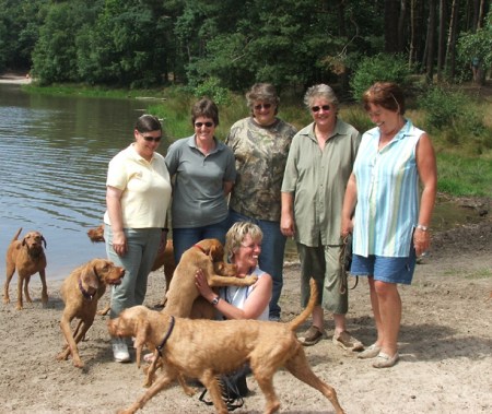 Okos heeft in deze test het maximale aantal punten behaald en werd als eerste gekwalificeerd. Daaropvolgend moest hij nog meedoen aan een exterieur keuring om zijn fokgeschiktheids certificaat te verkrijgen . Dat was natuurlijk geen enkel probleem omdat Okos een prachtige vertegenwoordiger van zijn ras is. Het certificaat "Tenyesztheto" werd met een uitmuntende beschrijving vlot aan hem uitgereikt. ![]() Op 14 augustus heeft hij ook nog meegedaan aan een show voor jachthonden in Nagyvazsony Hongarije . De Keurmeester was de bekende Vizsla specialist Tamas Jakkel. Hij is eerste geworden in zijn klas met de titel Hungaria Prima Junior. Op het laatste was het nog even spannend bij de verkiezing van de beste reu...bijna had Okos gewonnen maar zijn jeugdige leeftijd speelde hem parten hij verloor van de Kampioen en Europees kampioen 2005 Diana Ficsur . We houden U op de hoogte over Okos zijn verdere carierre. ![]() Vandaag heb ik afscheid genomen van onze grote Zwarte vriend Ranger. Alle mensen die ooit bij ons geweest zijn zullen zich hem herinneren als de grote zwarte Riesenschnauzer die hun zo vriendelijk bij de deur verwelkomde. Nooit zal ik de verbaasde gezichtten van sommige mensen vergeten die dachten een vizsla kennel te bezoeken en daar dan deze grote zwarte tegenkwamen, maar na enkele ogenblikken had hij met zijn charme de bezoekers ingepakt en overtuigd van het feit dat Riesen schnauzers hele aardige honden (kunnen)zijn . Ranger heeft heel veel betekend voor ons , we zullen hem missen , en zeker bij het socialiseren van onze pups , geen van onze pups is ooit bang geweest van grote zwarte honden Altough inasmuch as he had four legs and a tail And barked, I admit he was , to all outward appearances. But to those of us who knew him well , he was a perfect Gentlemen and friend . Sasvari Visconte Ranger Ch.Int, NL, H . (ipo 1) 15 April 1994 -2 Augustus 2005 ![]() ![]() 17 juli was een geweldige dag in de Vizsla historie , ter ere van het bezoek van Deb Wall uit Amerika (Konza Vadasz Kennel) had ik gemeend dat het heel interessant voor haar zou zijn om een aantal Draadharen bij elkaar te kunnen zien we hadden een wandeling georganiseerd in de Loonse en Drunse Duinen het was voor haar , maar ook voor ons spectaculair om zo veel honden bij elkaar te zien wat daarbij telkens weer opvalt is hoe de geweldige verdraagzaamheid van de honden onder elkaar is . Ter gelegenheid van het bezoek had ik ook mijn andere Vizsla vriendinnen gevraagd te komen , Ingeborg Caminici uit Duitsland (von Haus Schladren, Caroline Busby (UK Starshot) Pam Wellstead (UK Ragnolds) Jinke Jonkers Both (NL Quodijin's) samen zijn wij verantwoordelijk voor een grote (w.s de grootste) populatie aan lijnen binnen de draadharen waarbij de lezer kan begrijpen dat er die dag heel wat afgepraat is over de Vizsla en de fokkerij in de toekomst . Kijk voor meer foto's van de dag op deze link ![]() v.l.n.r. Pam Wellstead, Caroline Busby , Deb Wall, Ingeborg Caminneci, Jinke Jonkers Both. Vooraan: Lies van Essen ![]() Quodian's Kadushi is helaas niet drachtig bevonden door de dierenarts. Natuurlijk zijn we heel teleurgesteld maar hopen dat het de volgende keer wel lukt . Nu hopen we met smart dat Zenith snel loops wordt - dat zou einde van deze maand moeten gebeuren - zodat we dit jaar toch nog een nestje kunnen krijgen. Zodra daar nieuws over is zullen we dat laten weten . ![]() OPROEP !! Mijn vriendin Deb Wal uit USA (Konza Vadasz Kennel) brengt een bliksem bezoek aan Nederland het zou voor haar geweldig zijn om zo veel mogelijk draadhaar Vizsla's bij elkaar te kunnen zien Daarom wil ik graag een wandeling organiseren op Zondag 17 Juli om 12.00 uur verzamelen in de Loonse en Drunse Duinen te Kaatsheuvel , Laat ons even weten of U er bij bent ![]() (Ka) Dushi is nu 3 jaar en eindelijk loops voor de tweede keer omdat we niet het risiko willen nemen dat haar volgende loopsheid rond haar 5e verjaardag komt en zij dan wat oud is voor haar eerste nestje hebben wij besloten om haar te laten dekken door Eron Selle (Udo) wij hebben gekozen voor Udo omdat het nest van Byzar en Udo (de moeder van Dushi) 7 prachtige pups opgeleverd hebben met een fantastisch karakter . dus medio aug. verwachten wij puppies ![]() De pups zijn lekker buiten geweest! Kijk op de puppypagina voor meer nieuws en foto's ![]() De puppies zijn geboren!! Kijk op de puppypagina voor meer nieuws en foto's ![]() Vandaag heb ik met Bercsi (Komlosteri Bator) meegedaan aan de Veldwerk wedstrijd in Steenbergen. De omstandigheden waren niet ideaal. Wij moesten als eerste starten op een kaal opgeploegd stuk land. Vlgs Bercsi zat er geen wild en hij prefereerde het om achter de vogels aan te gaan , wat natuurlijk niet de bedoeling is. 's middags bij de tweede loop heeft hij goed zijn best gedaan, alhoewel er weer geen wild was heeft de keurmeester toch besloten om hem een eervolle vermelding toe te kennen. Het was een geweldige ervaring en ik was en ben heel trots en heb besloten om zeker door te gaan met dit geweldige (maar moeilijke) stuk jachthonden werk. ![]() Bijna alle pups van Kittie en Betyar zijn uitgevlogen , respectievelijk naar Finland(1) Duitsland (2) en de overige zijn in Nederland gebleven. Van een teefje konden wij geen afstand doen: zij blijft bij ons en hopen dat zij veel op haar vader Betyar gaat lijken. De naam die wij voor haar gekozen hebben is Panache: Frans voor van alles wat , hopen dat zij dat in zich heeft (jacht en schoonheid ) ![]() Leden vergadering Ned Vizsla club . Op deze vergadering ben ik als lid van de FBC (fok begleidings commisie) toegetreden . iI hoop dat ik met mijn kennis en ervaring een positieve bijdrage kan leveren aan deze comissie . ![]() Nieuwe foto's van de pups op de puppysectie! ![]() Op 09 februari is Kamp. Quodian's Byzar gedekt door Eron Selle . ![]() Meer foto's en stamboom op de puppysectie! ![]() Vandaag 30 januari zijn de pups van Gabci en Betyar geboren: 7 stoere jongens en 4 lieve meisjes. Binnenkort meer nieuws . ![]() V