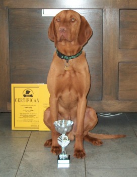 Nieuwsterug2007Nieuws uit Duitsland van Onze Kitty (Fürdohazi Gabci) Zoals jullie kunnen lezen en zien gaat het heel goed met haar en ik ben blij dat Kittie zo'n liefdevol tehuis gevonden heeft waar ze haar jachthond kwaliteiten ook nog kan gebruiken , Elisabeth dank je wel !!!!!!!!!!!!! Dear Lies, we wish you and your family a merry Christmas and a joyful 2008. Kitty is well as you can see on the two photos. Thomas took these pictures when we arrive from the "Brauchbarkeitsprüfung". In Germany hunting dogs need this basic test to be inclosed in the insurance I have with my hunting licence. The test has several parts, but I dont know the english terms, sorry. Kitty was the oldest dog and for me it was the first time with such a test. But all went well because we were two time a week on a training course which was from may to the end of August. I'm very proud on Kitty. After the test we were on some huntings this autumn and she was very good. When I have a bit mor time as I have at the moment :-) I'll send you some more pictures from Kitty at our home, she has some funny habits. Best Regards Elisabeth ! ![]() Winner dog show Amsterdam 2007 Het was me het weekendje wel. Het begon eigenlijk slecht omdat onze Éclair (Xtravaganza) - ingeschreven in de puppyklas - haar pootje bezeerde en niet mee kon. Ook Nina (Csövarberki Nimpha) - ingeschreven in de gebruikshondenklas - was niet aanwezig. Haar verzorger had een uitnodiging voor een jachtdag en met een echte jachthond ga je dan jagen en niet naar een show. Toch konden wij deze dag mooi afsluiten met 3 titels .